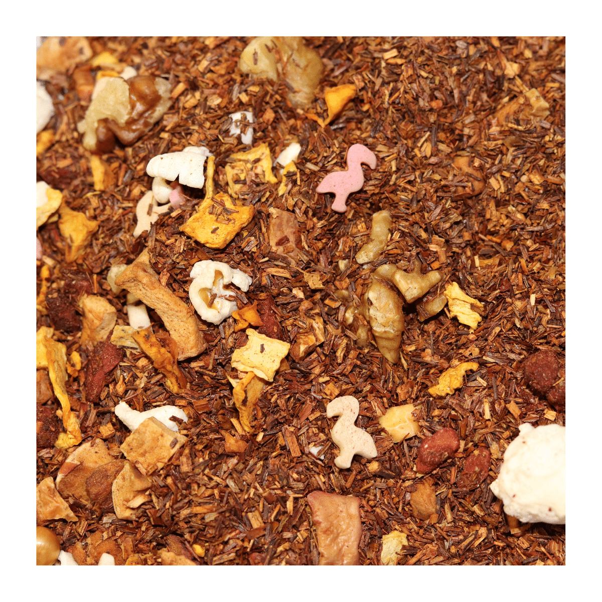 Ingrédients : Rooibos*, Pomme*, Citrouille*, Flamants roses en sucre (sucre, farine de riz, huiles de colza, fécule de pomme de terre, arôme), Grenade*, NOIX*, Arôme, Pop-corn* & Cannelle*