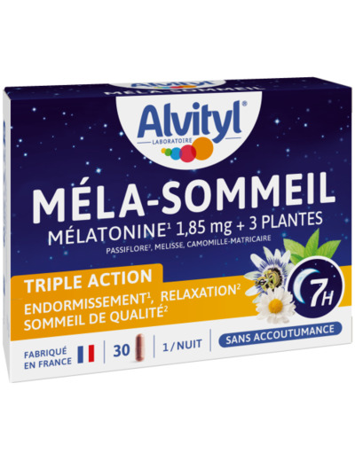 Alvityl® Méla-Sommeil agit à la fois sur l’endormissement, la relaxation et sur la qualité du sommeil, grâce à sa formule unique qui associe de la mélatonine et 3 plantes pour une triple action sur le sommeil :