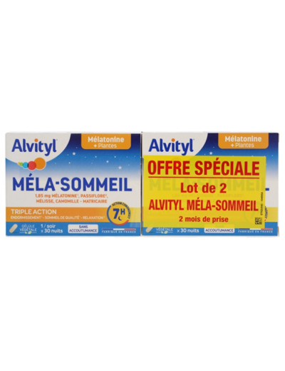 De la mélatonine, une hormone qui participe au processus d’endormissement permettant ainsi de réduire le temps d’endormissement*De la passiflore, une plante qui aide à une relaxation optimale, notamment en cas de stress et qui contribue à un sommeil de qualitéDe la mélisse, une plante d’Europe centrale et méridionaleDe la camomille-matricaire, une plante herbacée dont les fleurs ressemblent aux marguerites, utilisée depuis l’AntiquitéAlvityl® Méla-Sommeil est composé à 99% d’ingrédients d’origine végétale.
