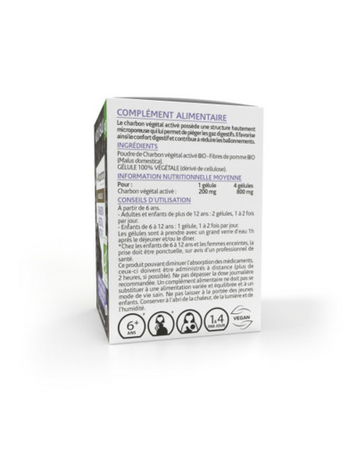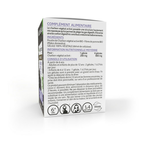 Le charbon végétal activé possède une structure hautement microporeuse qui lui permet de piéger les gaz digestifs. Il favorise ainsi le confort digestif et contribue à réduire les ballonnements.,Lire la suite