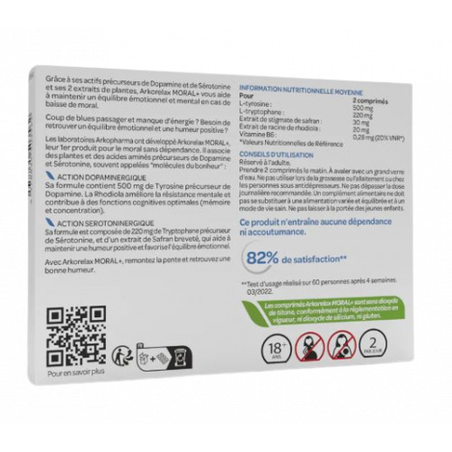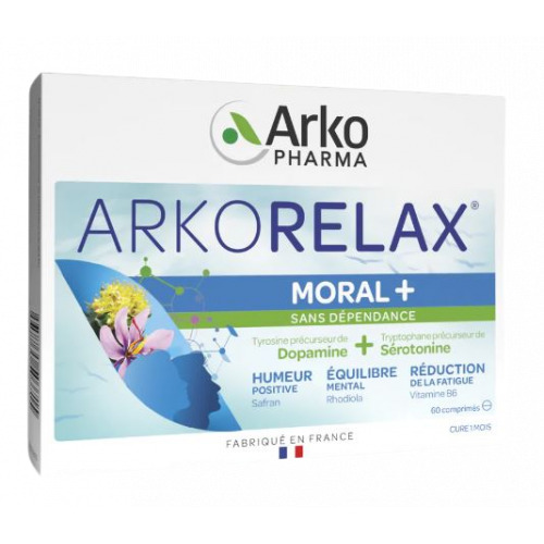 Action sérotoninergique Sa formule se compose de 220 mg de tryptophane (un précurseur de la sérotonine) et d'extrait de safran breveté pour aider à maintenir une humeur positive et favoriser l'équilibre émotionnel. Dévalez les pistes et retrouvez la bonne humeur avec ARKORELAX MORAL+. 87% ont retrouvé des émotions positives sans dépendance* *Grâce au safran. 60 personnes ont été testées pour une utilisation après 4 semaines. 87% ont déclaré être revenus à des émotions positives.