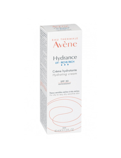 Grâce au toucher onctueux de cette crème riche, l’hydratation devient la base de la routine beauté de toutes les peaux sensibles déshydratées sèches à très sèches. Hydrance UV RICHE Crème hydratante leur apporte une recharge d’Eau thermale d'Avène, pour offrir 24h d'hydratation et une haute protection SPF 30. Sa texture riche non collante laisse la peau souple et désaltérée, protégée tout au long de la journée, tandis que son parfum subtil réveille les sens. Existe également en version teintée BB.