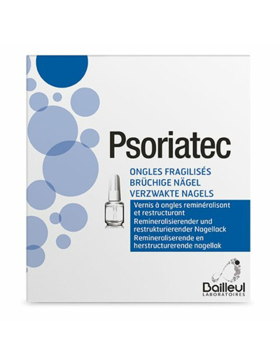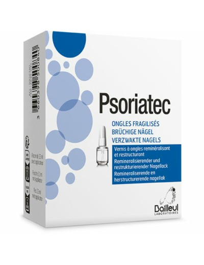 Psoriatec est un vernis à ongles spécifiquement conçu pour restructurer et reminéraliser les ongles atteints de malformation, de fragilité et de douleur locale, fréquemment présentes dans de nombreuses affections inflammatoires des ongles, telles que le psoriasis de l'ongle. Psoriatec peut également être utilisé pour protéger les ongles des agents chimiques contenus dans les vernis cosmétiques et autres dissolvants. Hydrosoluble, Psoriatec se retire avec un simple lavage à l’eau. Dispositif médical Iia. Flacon de 3,3 ml.