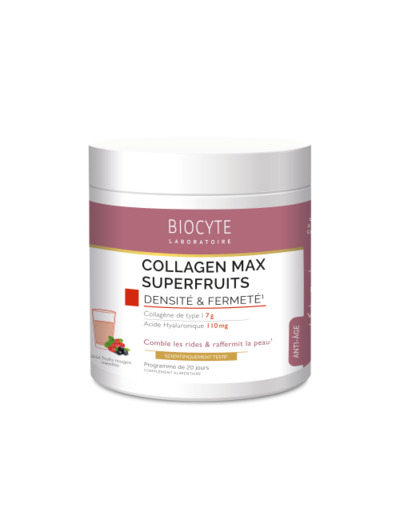 BIOCYTE COLLAGEN MAX SUPERFRUIT est une délicieuse boisson au bon goût fruité à base de collagène, acide hyaluronique et vitamines. Le collagène est la protéine la plus abondante de notre corps, c'est une des briques essentielles de la peau et elle assure sa densité. A partir de 35 ans, la production endogène de collagène décroit, la peau se creuse et les rides apparaissent progressivement. Apporter du collagène permet de réactiver la production naturelle de collagène et de combler les rides.