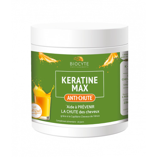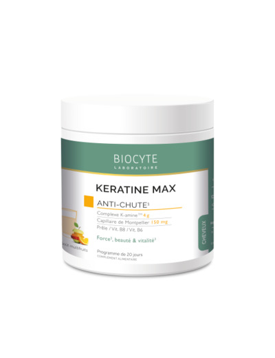 BIOCYTE KERATINE MAX est un complément alimentaire enrichi en complexe K-amine, constitué d’un spectre complet des 18 acides aminés soufrés essentiels qui composent la kératine capillaire. Nos cheveux étant constitués à 95% de kératine, Biocyte s’est inspiré de cette protéine pour développer une formule unique à concentration optimale en actifs pour la santé des cheveux. Le complexe K-amine est associé à la Capillaire Cheveux de Vénus, une plante qui aide à réduire la chute de cheveux, ainsi qu’à la prêle qui fortifie et renforce les follicules pileux. Il contient également des vitamines et minéraux (biotine, B6, zinc et sélénium) qui contribuent au maintien de cheveux sains.