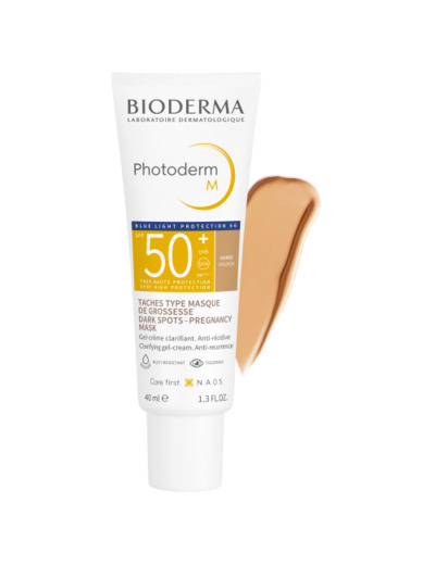 Photoderm M, gel-crème clarifiant teinté dorée pour les tâches type masque de grossesse SPF50+ doté de l'innovation "protection lumière bleue" texture gel-crème matifiant au fini poudré.