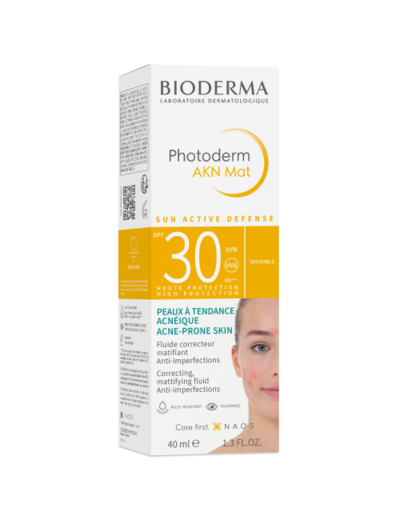 Bioderma Photoderm AKN Mat SPF 30 Fluide Matifiant 40 ml est un soin matifiant assure aux peaux mixtes à grasses une haute protection. Il résiste à l'eau. Bioderma AKN Mat SPF 30 fluide matifiant est spécialement conçu pour protéger la peau mixte à grasse tout en réduisant la survenue d'imperfections. En effet, il contient Fluidactiv, un complexe régulateur de sébum. Il est doté d'une texture matifiante qui ne laisse pas de traces blanches lors de l'application. D'indice SPF 30, il offre une haute protection contre les UV. Il est efficace aussi bien contre les UVA que les UVB. En effet, les rayons ultra-violets qui nous parviennent sont de deux types : UVA et UVB, tous deux nocifs pour la peau.