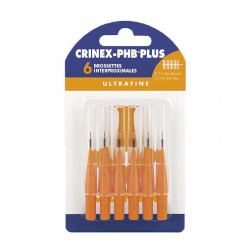 La Brossette Ultrafine PHB Plus de Crinex (blister 6 unités) est une brossette interdentaire permettant de nettoyer les espaces plus étroits entre vos dents. Ultra fine, la brossette PHB Plus Ultrafine est équipée d'une brosse de 2 mm de diamètre et d'une tige de 0,45 mm de diamètre.