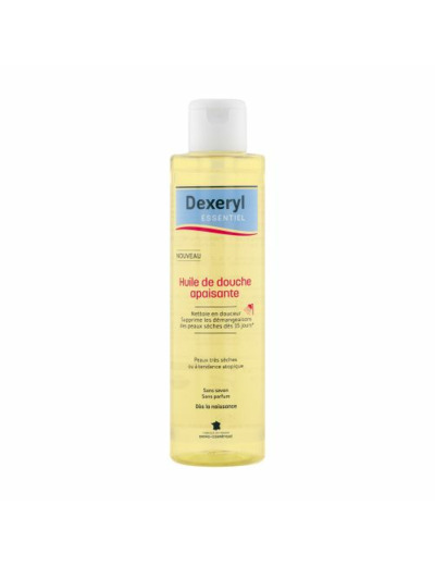 L’Huile de douche apaisante Dexeryl ESSENTIEL est spécialement conçue pour nettoyer en douceur les peaux sèches et/ou à tendance atopique. Elle relipide la barrière cutanée et contribue ainsi à supprimer 100% des démangeaisons liées à la sécheresse cutanée dès 15 jours. La peau est apaisée dès la première utilisation