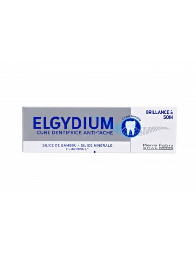 Le dentifrice anti taches Elgydium Brillance et soin agit à la fois sur le nettoyage des dents et sur la diminution des taches. Cette double-action vient de sa composition qui contient du fluorinol, un actif breveté par Pierre Fabre Oral Care qui se fixe sur l’émail des dents pour les reminéraliser, les renforcer et les protéger. Le fluorinol permet aussi d’augmenter la résistance des dents aux acides produits par les bactéries. L’action lissante de ce dentifrice anti taches qui redonne de la brillance est apportée par l’association de la silice minérale qui nettoie et élimine les taches et de la silice de bambou qui, avec ses fines particules, polit les dents en douceur.