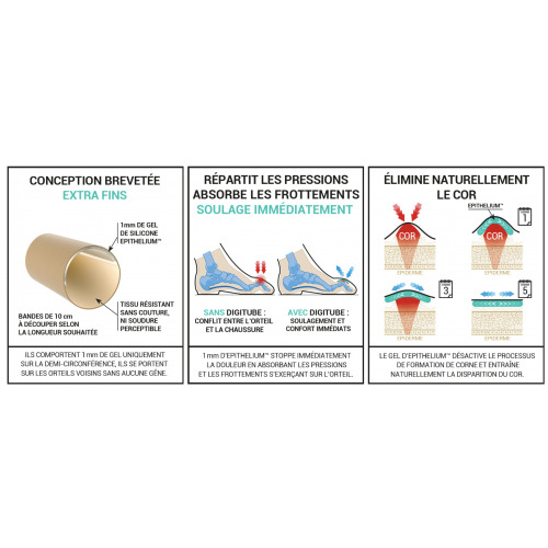 Grâce au gel silicone EpitheliumTM qui le constitue, il évite la corne et les douleurs liées à des pressions et frottements excessifs.