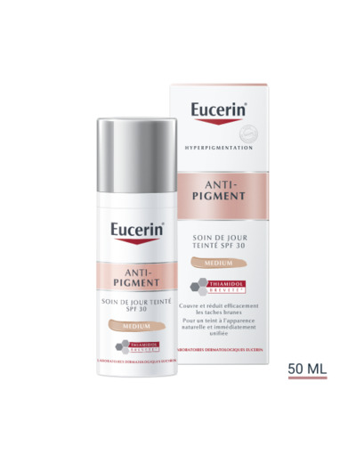 Le Soin de Jour Teinté Light SPF 30 ANTI-PIGMENT d'Eucerin contient du Thiamadol, un ingrédient efficace et breveté qui agit à la source de l'hyperpigmentation en réduisant la production de mélanine. Il est prouvé par des études cliniques et dermatologiques qu'il réduit efficacement les taches brunes et empêche leur réapparition. Les premiers résultats sont visibles après deux semaines et s'améliorent continuellement avec une utilisation régulière.Avec la protection SPF 30 + UVA, le Soin de Jour protège efficacement du soleil et prévient la formation de futures taches brunes induites par le soleil. Les pigments minéraux donnent au teint une apparence unifiée et d'un éclat naturel.