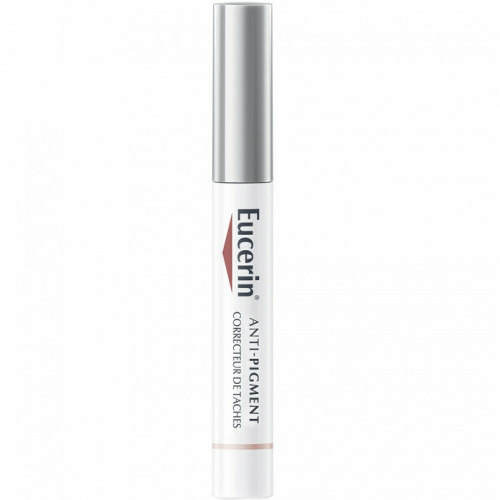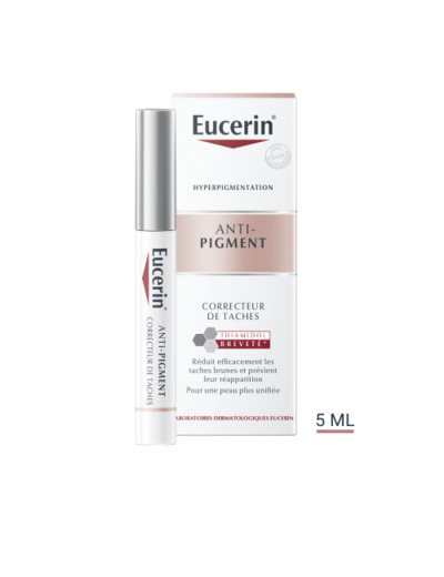 Eucerin ANTI-PIGMENT Correcteur de Taches est un gel non gras avec un applicateur qui facilite l'application précise aux petites zones d'hyperpigmentation. Il contient du Thiamidol, un ingrédient efficace et breveté qui agit à la base de l'hyperpigmentation en réduisant la production de mélanine. Appliqué directement sur les taches brunes, il a été prouvé par des études cliniques et dermatologiques qu'il réduisait et empêchait leur réapparition. Les premiers résultats sont visibles après deux semaines et s'améliorent continuellement avec une utilisation régulière. La peau apparaît plus uniforme.