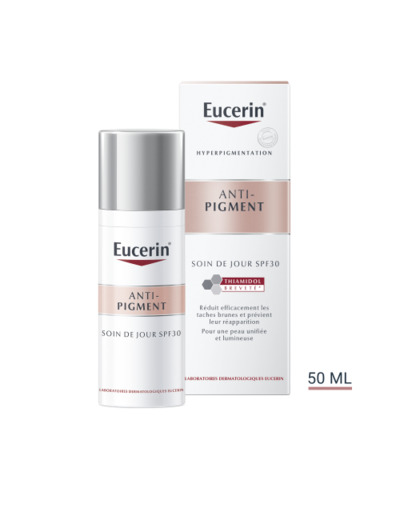 Eucerin Anti-Pigment Soin de Jour SPF 30 50 ml Réduit efficacement les taches brunes et empêche leur réapparition. Une crème de jour hydratante avec protection UVA et UVB pour une peau uniforme et éclatante.Eucerin ANTI-PIGMENT Soin de Jour SPF 30 contient du Thiamidol, un ingrédient efficace et breveté qui agit à la base de l'hyperpigmentation en réduisant la production de mélanine. Il est prouvé par des études cliniques et dermatologiques qu'il réduit les taches brunes et empêche leur réapparition. Les premiers résultats sont visibles après deux semaines et s'améliorent continuellement avec une utilisation régulière.Avec les filtres UVA et UVB (SPF 30), la crème de jour hydratante protège efficacement du soleil et réduit les risques de formation de taches pigmentaires induites par la peau. La peau paraît uniforme et éclatante.