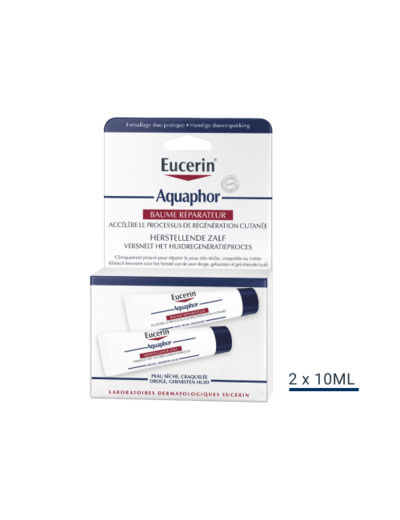 Eucerin Aquaphor Baume Réparateur apporte à la peau sèche à très sèche, craquelée et irritée le soins SOS dont elle a besoin. Le Baume sans eau forme une barrière protectrice douce, semi-occlusive et protectrice sur la peau qui favorise le transfert naturel de vapeur d'eau et d'oxygène vers et depuis la peau, permettant à celle-ci de " respirer " et de renforcer sa barrière protectrice naturelle. Le Baume Aquaphor est enrichi en glycérine et panthénol. La glycérine est un hydratant efficace qui attire l'eau et aide à la maintenir dans la peau. Il agit aux côtés du panthénol qui aide à accélérer la régénération et la réparation tout en hydratant la peau.