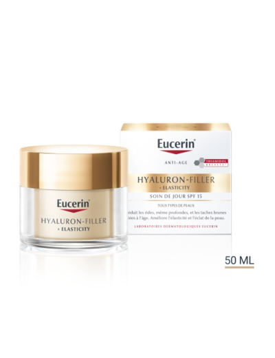 EUCERIN HYALURON-FILLER + ELASTICITY Soin de Jour SPF 15 renforce la structure de la peau en améliorant son élasticité et comble les rides profondes.