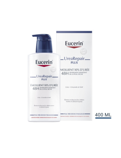 Eucerin UreaRepair PLUS Émollient 10% d'Urée 400 ml est un lait pour le corps de texture riche enrichi en urée et lactate qui convient aux peaux très sèches, squameuses et irritées.