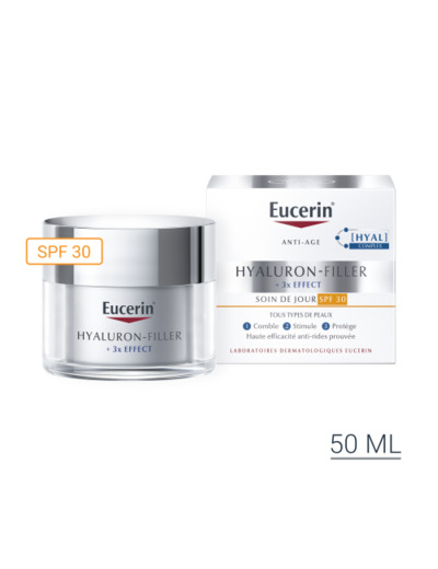 Avec l'âge, la production naturelle d'Acide Hyaluronique de notre peau décroît : des rides et ridules se forment, la peau paraît moins jeune. Le Soin de Jour SPF 30 HYALURON-FILLER + 3X EFFECT ralentit ce processus grâce à sa formule :