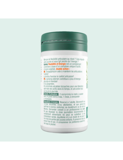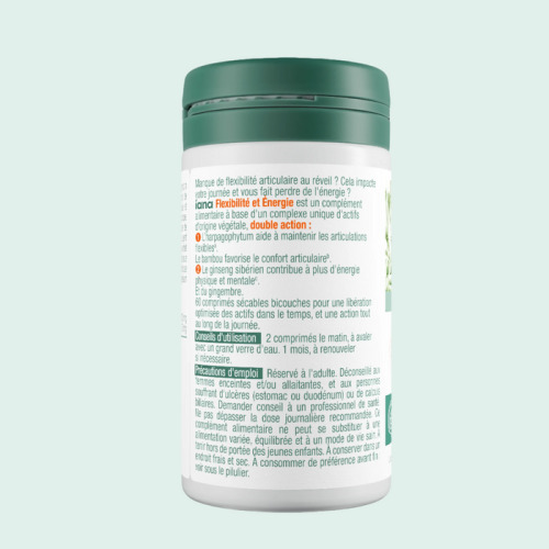 Un complément alimentaire qui vous aide à maintenir des articulations flexibles avec l’harpagophytum (500 mg/j) et favorise le confort articulaire avec le bambou (70 mg/j).