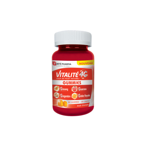 Pour donner un coup de fouet* naturel à votre organisme, Vitalité 4G Gummies regroupe 4 actifs dynamisants : Guarana, Ginseng, Gingembre et Gelée royale dans de délicieuses gummies au goût orange. Un format agréable, pratique et délicieux qui vous évitera d’oublier de les prendre, le matin ou dans la journée quand le besoin s’en fait sentir !