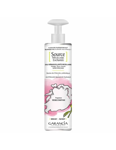 NOTE YUKA : EXCELLENTSource Micellaire Enchantée réunit 4 actions en un seul geste :- Nettoie, Démaquille (Visage, Yeux, Lèvres)- Hydrate- Apaise- IllumineNouveau flacon 400 ml : Système pratique de pompe disque avec distribution vers le haut. Dans une volonté de travailler de manière plus responsable, ce flacon contient 100% de plastique recyclé (soit une économie de 3,9 tonnes de plastique vierge par an* !). Prête à faire un geste pour la planète ?ÉCO-RECHARGE 400 ml : ÉCOLOGIQUE et ÉCONOMIQUE, elle me permet de recharger mon flacon Alors Rechargez, Démaquillez et Préservez !*Basé sur les prévisions de ventes de 2021Nouvelle formule encore plus clean !Actif BREVETÉ hydratant et apaisant issu de la glycobiologie : testé cliniquement contre placebo (19 sujets - 18 à 70 ans), il diminue significativement de 47 % la sensation d’irritation et de picotement dès 5 min.Extrait de racine de Chicorée, précieux prébiotique qui nourrit le microbiote cutané. Formule Vegan et Made in France