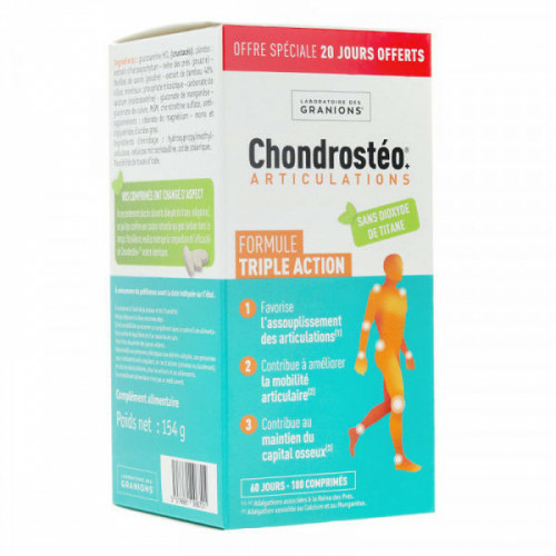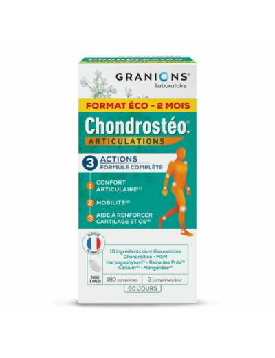Chondrostéo+ articulations est un complément alimentaire qui favorise l'assouplissement des articulations (1), contribue à améliorer la mobilité articulaire (2) et contribue au maintien du capital osseux (3).