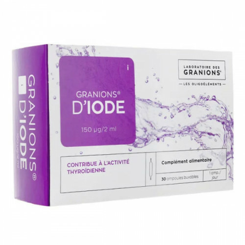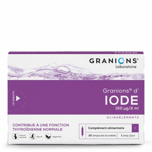 Granions d'iode est un complément alimentaire sous forme d'ampoules buvables à base d'Iode, oligo-élément essentiel, indispensable à la biosynthèse des hormones thyroïdiennes : T4 et T3, sa forme active.Les hormones thyroïdiennes sont impliquées de façon privilégiée dans divers processus fondamentaux : métabolisme cellulaire, balance énergétique (dont calorigénèse et thermorégulation), métabolisme des glucides, des lipides, synthèse protéique et enzymatique.Ce complément alimentaire à prendre en complément d'une alimentation variée et équilibrée, et d'un mode de vie sain.