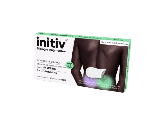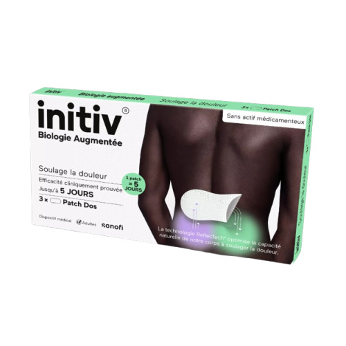 initiv® est un patch pour le dos sans actif médicamenteux, ultrafin, résistant à l'eau et sans odeur, conçu contre les douleurs musculo-squelettiques (touchant les articulations, les muscles et les tendons) au niveau du dos de l'adulte. Grâce à la technologie ReflecTech®, le patch initiv® pour le dos réfléchit l'énergie infrarouge émise naturellement par le corps vers la zone douloureuse pour soulager les douleurs musculosquelettiques aiguës (courte durée) jusqu'à cinq jours.