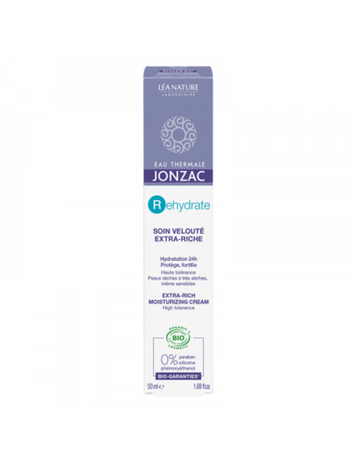 Hydratation 24h, protège, fortifie.,Enrichi en eau thermale de Jonzac, glycérine végétale et acide hyaluronique d'origine naturelle, le soin velouté extra-riche Rehydrate active immédiatement l’hydratation naturelle de la peau.,Lire la suite