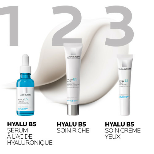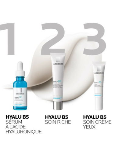 Hyalu B5 Riche offre une formule unique intensément hydratante et nourrissante, alliant deux types d’acide hyaluronique et de la vitamine B5.