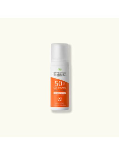 Le lait solaire SPF50 protège immédiatement des rayonnements UVA/UVB grâce à l'association unique d'écrans minéraux et d'Alga-Gorria®, un extrait antioxydant breveté d'algue rouge issue de la côte basque, qui prévient notamment le vieillissement cutané.
