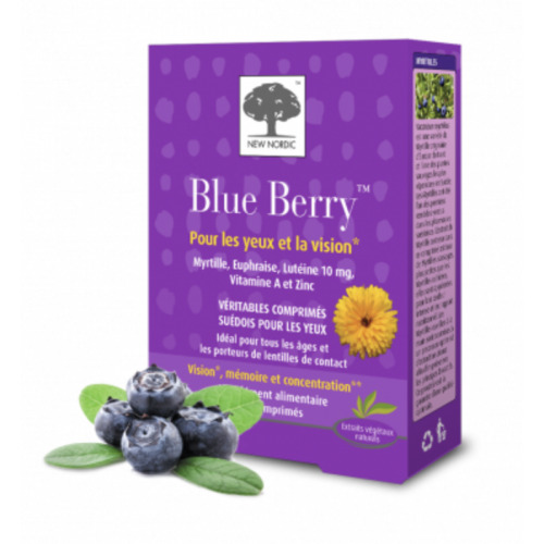 La formule unique de Blue Berry associe un extrait de Myrtilles, dont les effets bénéfiques sur les yeux ont été scientifiquement prouvés, à des extraits d’Euphraise et de Rose d’Inde, qui apporte de la lutéine naturelle. Sa forte concentration en actifs végétaux lui permet d’agir efficacement sur les yeux mais aussi sur le système nerveux, responsable du traitement des informations liées à la vue.