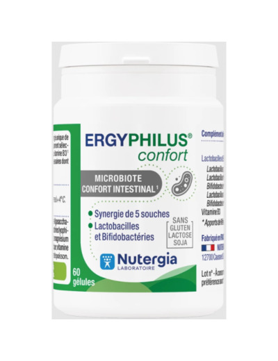 ERGYPHILUS® Confort est un complément alimentaire constitué d’une synergie unique de 5 souches vivantes. Il contient des lactobacilles et bifidobactéries rigoureusement sélectionnés pour leurs propriétés :