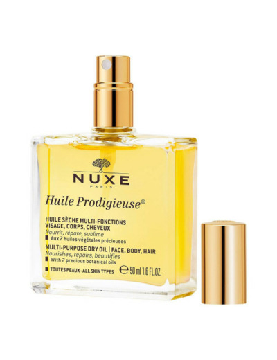 Nuxe Huile Prodigieuse Visage-Corps-Cheveux 50 ml est une huile sèche multi-fonctions qui peut s'utiliser aussi bien pour le soin du visage, du corps et des cheveux. Cette huile prodigieuse contient une concentration de 6 Huiles Précieuses et également de la Vitamine E. Cette huile est un véritable soin complet car elle nourrit et hydrate. Dès son application, elle pénètre dans la peau pour la laisser douce et satinée en un instant. Elle rendra également vos cheveux souples et brillants. Ce baume est riche en miel qui est une substance très réparatrice et cicatrisante.Des huiles précieuses végétales vont apporter tous leur bienfaits à votre peau. Ainsi l'huile d'argan aura une action anti-âge car elle est riche en acide gras et vitamine E. L'huile de bourrache a des vertus protectrice et réparatrice de la peau et lui redonne de l’élasticité. L'huile de soja va lui permettre de retrouver sa densité et son élasticité car elle stimule la production de fibres de collagène et d'élastine. Et enfin l'huile de tournesol est adoucissante et nourrissante, ce qui la rend adaptée aux peaux sèches à très sèches. Ce baume corps fondant, au miel et huiles végétales a une texture fondante lors du massage et qui permet d'envelopper votre peau et de la réconforter, mais sans effet collant.Grâce à son utilisation quotidienne, votre peau retrouvera toute sa souplesse et sa fermeté.