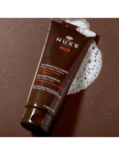 Le Gel Douche Multi-Usagee Nuxe Men nettoie le corps, le visage et les cheveux. Aux extraits de Chêne et de Charme, il convient à toutes les peaux, même sensibles. Avec sa base lavante d'origine végétale et son pH physiologique, ce gel moussant nettoie en douceur et procure une véritable sensation énergisante.