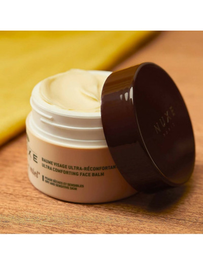 Nuxe Rêve de Miel Baume Visage Ultra-Réconfortant 50 ml est un baume spécialement formulé pour l'hydratation et la protection des peaux sèches et sensibles.Ce baume onctueux est formulé à base de Miel, de Propolis et d'huiles précieuses, il est un véritable concentré de nutrition. Dès son application, il relipide, nourrit intensément, réconforte immédiatement la peau et la protège des agressions extérieures.Le baume visage ultra-réconfortant Rêve de Miel de la marque Nuxe est un soin destiné aux peaux sèches et sensibles. Il contient 92,9% d'ingrédients d'origine naturelle, dont le principal est le miel. Ce dernier dispose de nombreuses propriétés réconfortantes idéales pour les peaux sèches et très sèches, comme ses vertus réparatrices par exemple. Il est associé à diverses huiles végétales précieuses telles que l'huile d'argan, de son de riz ou de macadamia, qui offrent à ce baume le pouvoir de nourrir intensément, d'apaiser et de réparer la peau, tout en la protégeant des diverses agressions extérieures auxquelles cette dernière est confrontée au quotidien. Il permet également de préserver la barrière cutanée, assurant une meilleure protection de la peau. Ainsi, les désagréments liés à la peau sèche comme les sensations d'irritations et de tiraillements, ou encore les rugosités et les rougeurs diminuent, tandis que l'épiderme retrouve plus de souplesse, pour un confort optimal. Il est doté d'une texture miellée et onctueuse, accompagné d'un parfum savoureux qui offre un véritable voyage des sens, enveloppant la peau de réconfort. Le baume visage ultra-réconfortant Rêve de Miel de Nuxe permet ainsi de nourrir intensément les peaux sèches et sensibles, pour un meilleur confort et une peau plus douce au quotidien.
