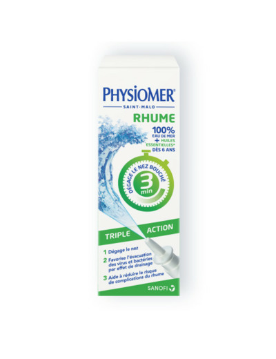 PHYSIOMER Rhume Triple Action– Ce dispositif médical est un produit de santé qui porte au titre de la réglementation le marquage CE. Lire attentivement la notice avant utilisation. Demandez conseil à votre pharmacien. Fabricant: Laboratoire de la Mer – Juillet 2020. Dispositif médical CE.