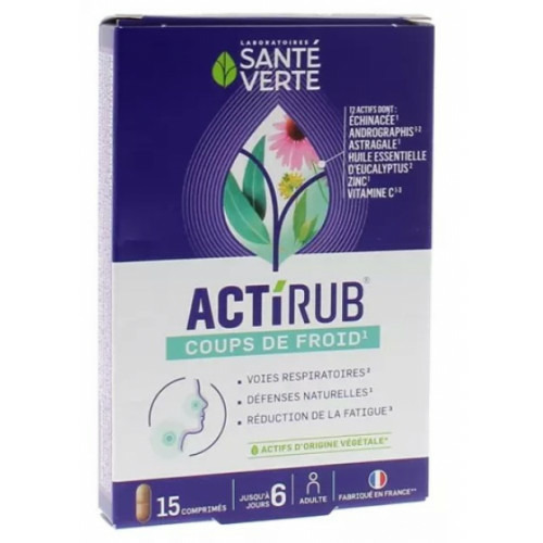 Actirub Nez & Gorge* est un complément alimentaire à base de préparations de plantes, huile essentielle, Vitamine C, Zinc et substance à but nutritionnel ou physiologique. Il contient de l'Huile essentielle d'Eucalpytus et un complexe de 8 plantes.*Echinacée, Andrographis. En hiver notre organisme fait face à de nombreuses agressions et notre système immunitaire est donc plus régulièrement sollicité. Actirub comprimés est un complexe d'actifs, avec notamment de :