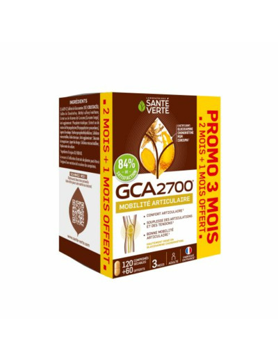 SANTÉ VERTE GCA2700 est un complément alimentaire qui contribue au confort articulaire grâce à la présence de MSM, d'Harpagophytum, de Chondroitine, de Glucosamine et de Curcuma.Utilisé à long terme en association à la Chondroïtine et la glucosamine, il contribue au maintien de la souplesse, de la santé des tendons et des articulations.