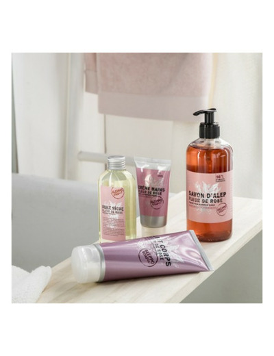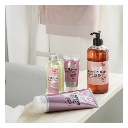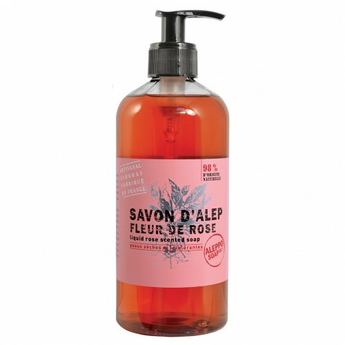 Savon d'Alep liquide Fleur de rose. Peaux sèches et intolérantes. Flacon-pompe de 500 ml.