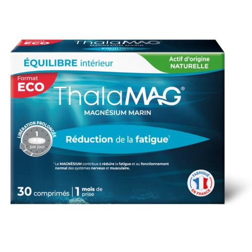 Fatigue ? Nervosité ? Fatigue musculaire ? Le magnésium marin contenu dans THALAMAG® Équilibre Intérieur LP tire sa force naturelle de la mer d’Irlande. Il apporte 300 mg de magnésium marin (sous forme d’hydroxyde) par jour, qui contribue à réduire la fatigue et participe au fonctionnement normal du système nerveux ainsi qu’a des fonctions musculaires et psychologiques normales.