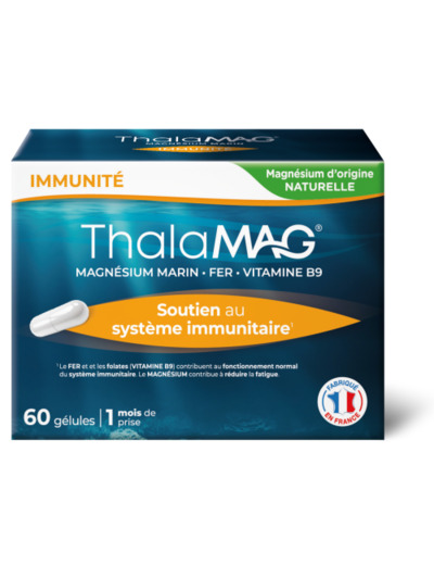 THALAMAG® IMMUNITE vous aide à soutenir votre système immunitaire grâce à sa formule en fer et en folates (vitamine B9) qui contribuent au fonctionnement normal du système immunitaire.