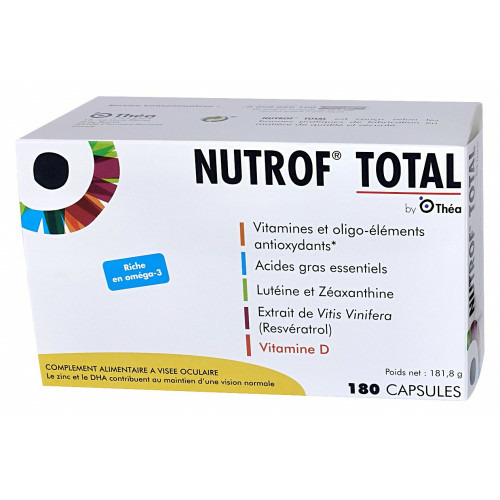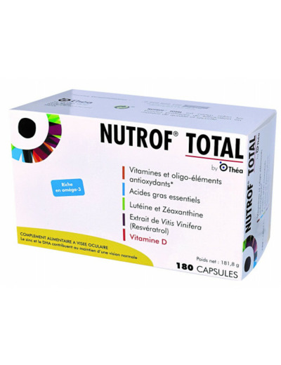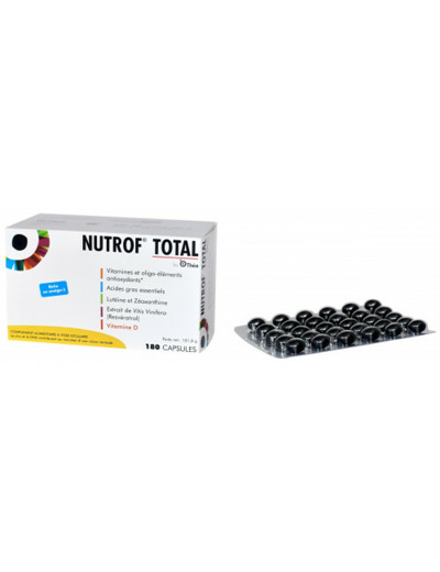 Nutrof Total est un complément alimentaire contenant des vitamines et oligoéléments antioxydants, de la lutéine, de la zéaxanthine, des acides gras poly-insaturés oméga 3 et un extrait de Vitis vinifera (resvératrol).