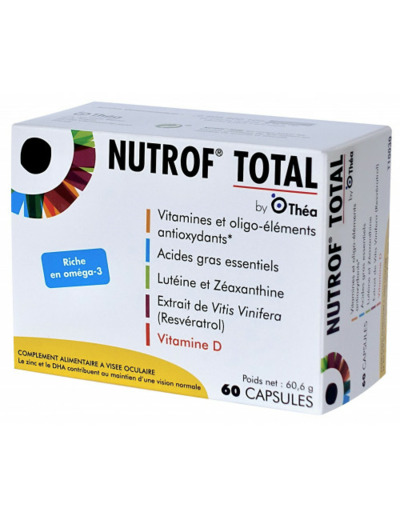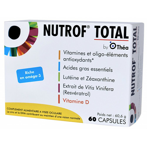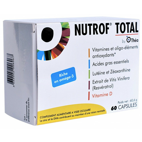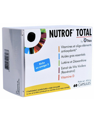 Nutrof Total est un complément alimentaire contenant des vitamines et oligoéléments antioxydants, de la lutéine, de la zéaxanthine, des acides gras poly-insaturés oméga 3 et un extrait de Vitis vinifera (resvératrol).