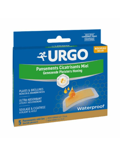URGOPansements CicatrisantsMiel médical naturelPlaies et brûluresUltra-absorbantSoulage et cicatriseDispositif médical5 pansements stériles4.5x7.5cmGrâce à sa compresse Hydro-Miel, URGO Pansements Cicatrisants Miel absorbe les exsudats, soulage et favorise la cicatrisation de vos plaies et brûlures superficielles. Son support transparent waterproof résiste à l’eau et apporte une protection en toute discrétion.Astuce !Le pansement forme une sensation de seconde peau qui limite les frottements.Laboratoires URGO42, rue de longvic – BP 157 – 21304 Chenôve Cedex