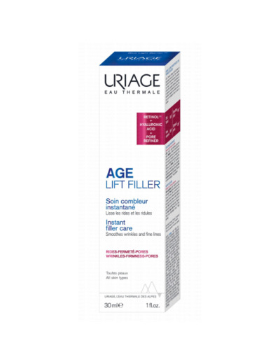 Uriage Age Protect Soin Combleur Multi-Corrections Instantané 30 ml est un soin indiqué pour tous les types de peaux et qui agit instantanément sur les signes visibles de l'âge :- Action Filler-like (Effet comblant) : son acide hyaluronique réticulé cible spécifiquement les rides (patte d'oie, sillons, contour des lèvres...) pour lisser visiblement la surface cutanée ;- Action Blur (Effet flouteur) : son agent pore-refiner est associé à des poudres soft-focus pour resserrer les pores et flouter visiblement marques, taches, grains de peau irréguliers.Ce soin combleur multi-corrections instantané de la gamme AGE PROTECT estompe les signes visibles de l’âge et les corrige durablement.1/ Effet instantanéSon acide hyaluronique réticulé cible spécifiquement les rides (patte d'oie, sillons, contour des lèvres...) pour lisser visiblement la surface cutanée. Son agent pore-refiner est associé à des poudres soft-focus pour resserrer les pores et flouter visiblement marques, taches et grain de peau irrégulier.2/ Corrige les signes de l'ageLe meilleur des actifs anti-âge (Rétinol*, Acide Hyaluronique, Sang du dragon, Vitamines C et E) pour agir simultanément sur le lissage des rides, le relâchement cutané et l’homogénéité du teint.3/ ProtègeSon Brevet exclusif Uriage BLB – Barrière Lumière Bleue- protège la peau du stress oxydatif causé par la lumière bleue. Les gommes végétales, FILMEXEL® forment un film protecteur pour un effet “seconde peau”.