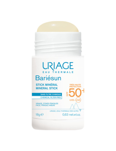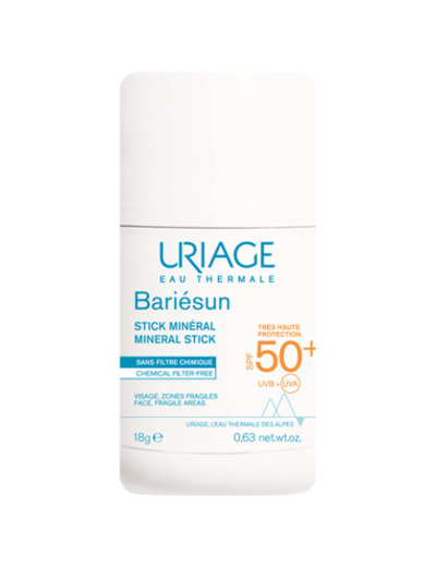 Uriage Bariésun Stick Minéral SPF 50+ 18g est une très haute protection solaire pour zones fragiles comme les mains, les oreilles, le nez, le crane, les cicatrices, les taches.