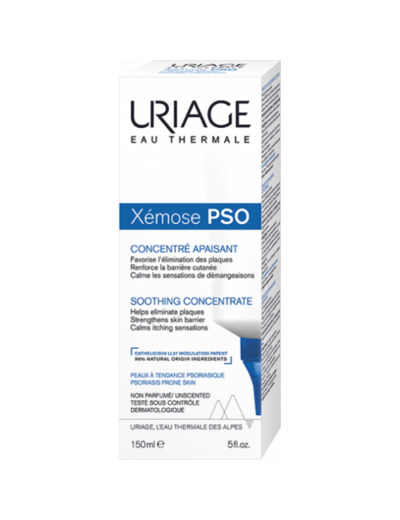 Xémose PSO Concentré Apaisant, calme les sensations de démangeaisons et renforce la barrière cutanée en associant l’Eau Thermale d’Uriage et deux brevets dermatologiques. Testé sous contrôle dermatologique, son efficacité est prouvée sur les peaux à tendance psoriasique: Favorise l’élimination des plaques 90%**