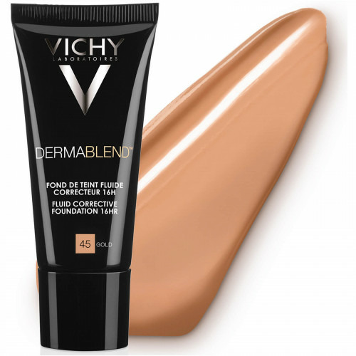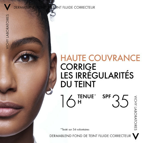 La formule du fond de teint fluide correcteur Dermablend allie une haute concentration en pigments pour une correction optimale à une texture ultra-étirable, si légère qu'elle fusione avec la peau pour un résultat très naturel et un confort parfait toute la journée. Au contact de l''épiderme, la texture se fluidifie, offrant une dispersion maximale de la couleur pour une correction parfaite des défauts cutanés, sans créer de surcharges localisées ni d'effet masque sec. Ce fond de teint vous offre une triple action : Haute correction 16H + Un authentique résultat beauté+ confort optimal : 24H d'hydratation. 1. Des pigments concentrés à 30%, pour une correction parfaite. 2. La présence de pigments soft-focus pour flouter les imperfections avec un résultat beauté comparable à celui d'un fond de teint classique. 3. Enrichie en glycerine et en huile volatile d'origine végétale qui lui apporte glissant, fluidité et confort. Capable de se fluidifier avec la chaleur de la peau, sa texture crée une très fine couche, sans marquer les rides ni laisser de film gras. Le teint est totalment unfié avec un fini peau nue naturel.