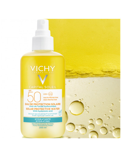 L'eau de protection solaire SPF 50 Capital Soleil du laboratoire Vichy est une solution aqueuse bi-phasée qui préserve la peau de la nocivité des rayons UVB et UVA, les plus dangereux du soleil. Les premiers sont responsables des coups de soleil et des brûlures plus ou moins superficielles, après une exposition prolongée sans protection. Les seconds, quant à eux, ont une longueur d'onde suffisance pour pénétrer plus profondément à travers les couches cutanées et occasionner des dégâts plus importants et durables. Ils altèrent, en effet, le métabolisme cellulaire et sont susceptibles de causer un dessèchement important de la peau, des rides ainsi que des tâches cutanées, par dérèglement de la sécrétion de la mélatonine.